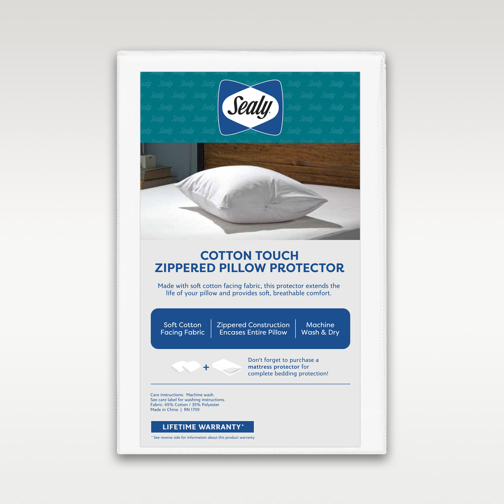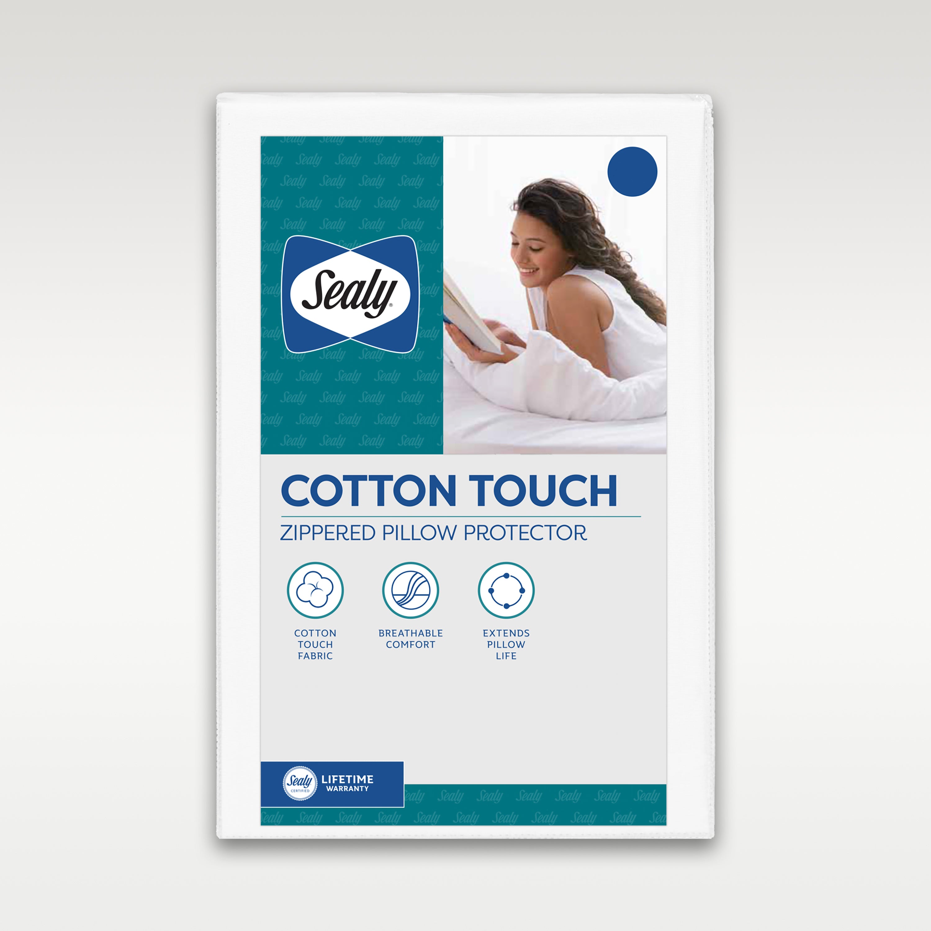 The Sealy Cotton Touch Pillow Protector is made with soft cotton touch fabric. It provides soft, breathable comfort throughout the night without altering the feel of your pillow. The zippered construction encases the pillow fully and helps extend its life.