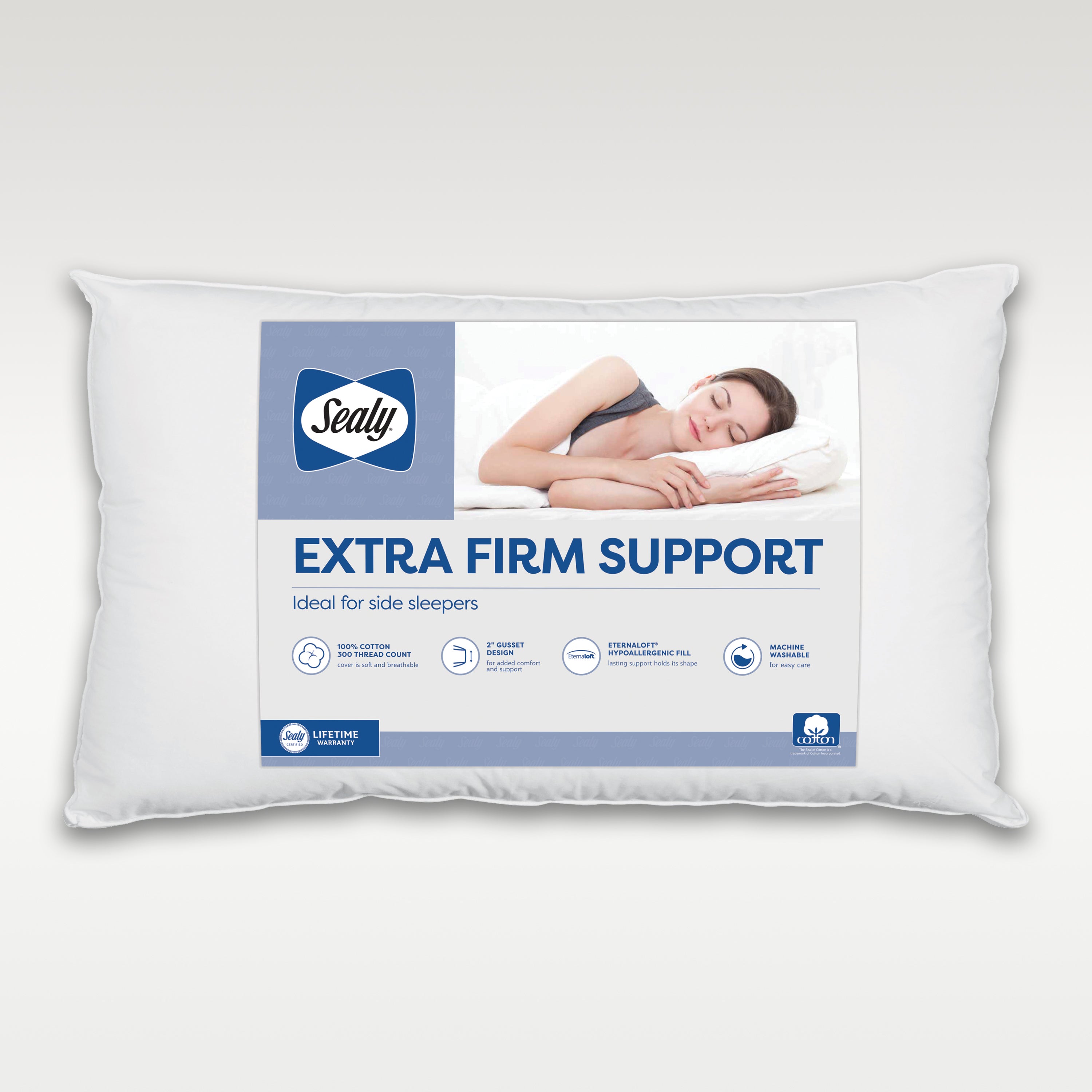 The Sealy Extra Firm Support Pillow offers the ideal support for side sleepers. A generous two inch gusset and ETERNALOFT™ hypoallergenic fill provide long lasting support and comfort. This soft and breathable pillow is made from 100% cotton, 300 thread count for a perfect night's sleep.